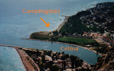 Der Campingplatz “Galeb” in Omis hat uns gleich gut gefallen, da er eingezäunt war und über einen eigenen Strand verfügt, der nur Campinggästen zur Verfügung steht. Der Strand besteht aus feinkörnigem Kies der schon fast mit Sand zu vergleichen ist. Das Meer ist an dieser Stelle sehr flach abfallend, sodaß man auch kleinere Kinder gefahrlos mit an den Strand bzw. ins Wasser nehmen kann. Nach zehn Metern ist das Wasser nur Knietief und nach 50 Metern kann ein Erwachsener immer noch stehen. Durch die Mündung des Flusses Cetina ist das Wasser nicht so Salzig wie man es von der Adria her gewohnt ist, leider ist es auch ein paar Grad kälter.